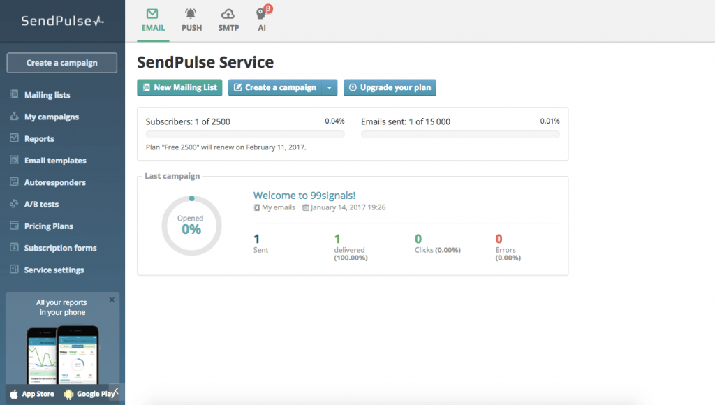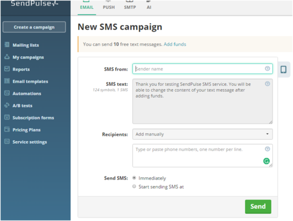SendPulse is a marketing platform that allows you to do multiple things such as sending emails to your users or even sending SMS messages to your users. Before spending any money, you can sign up for free to test it out.